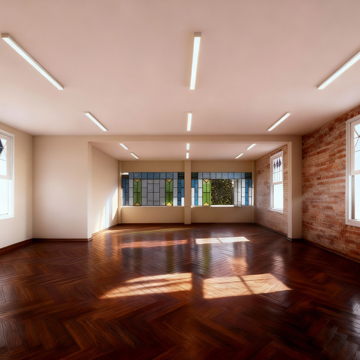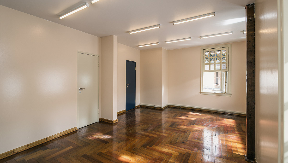 Uma sala multifuncional. Para ser ocupado por aulas de dança e corpo, artes plásticas e visuais, ensaios, audições, workshops e palestras.